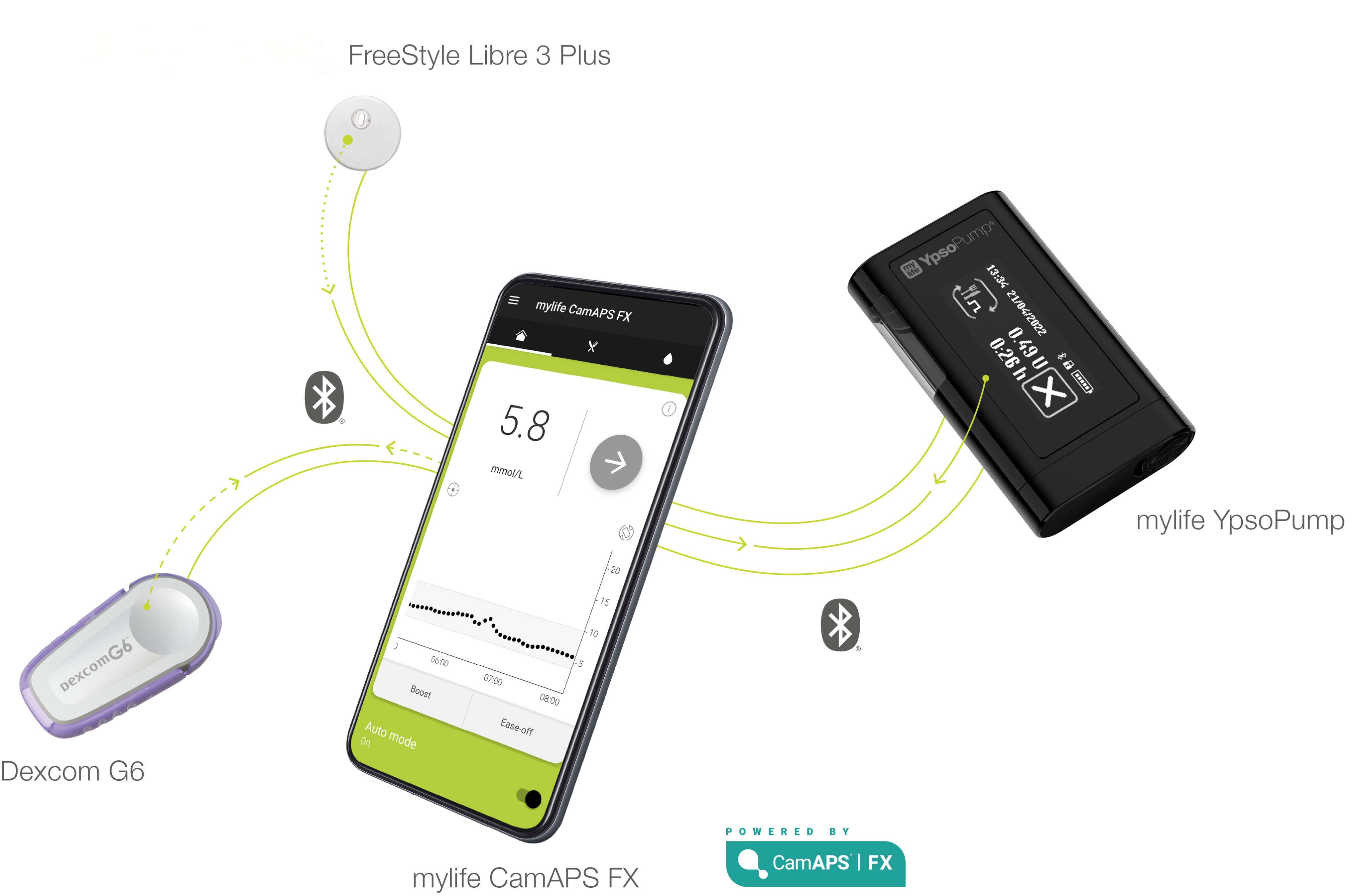 Smartphone based therapy management is the future of diabetes treatment. Combine the mylife YpsoPump insulin pump, the mylife CamAPS FX mobile application and the Dexcom G6 or FreeStyle Libre 3 PLUS Continuous Glucose Monitoring (CGM) System for an automated insulin delivery system managed directly from your smartphone. The integration of automated insulin delivery into the mylife YpsoPump system portfolio allows you time away from your diabetes and more freedom to do what you love doing.